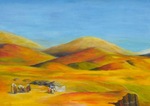 2011Warm kleurig schilderij met woestijn, gebergte en nomaden.